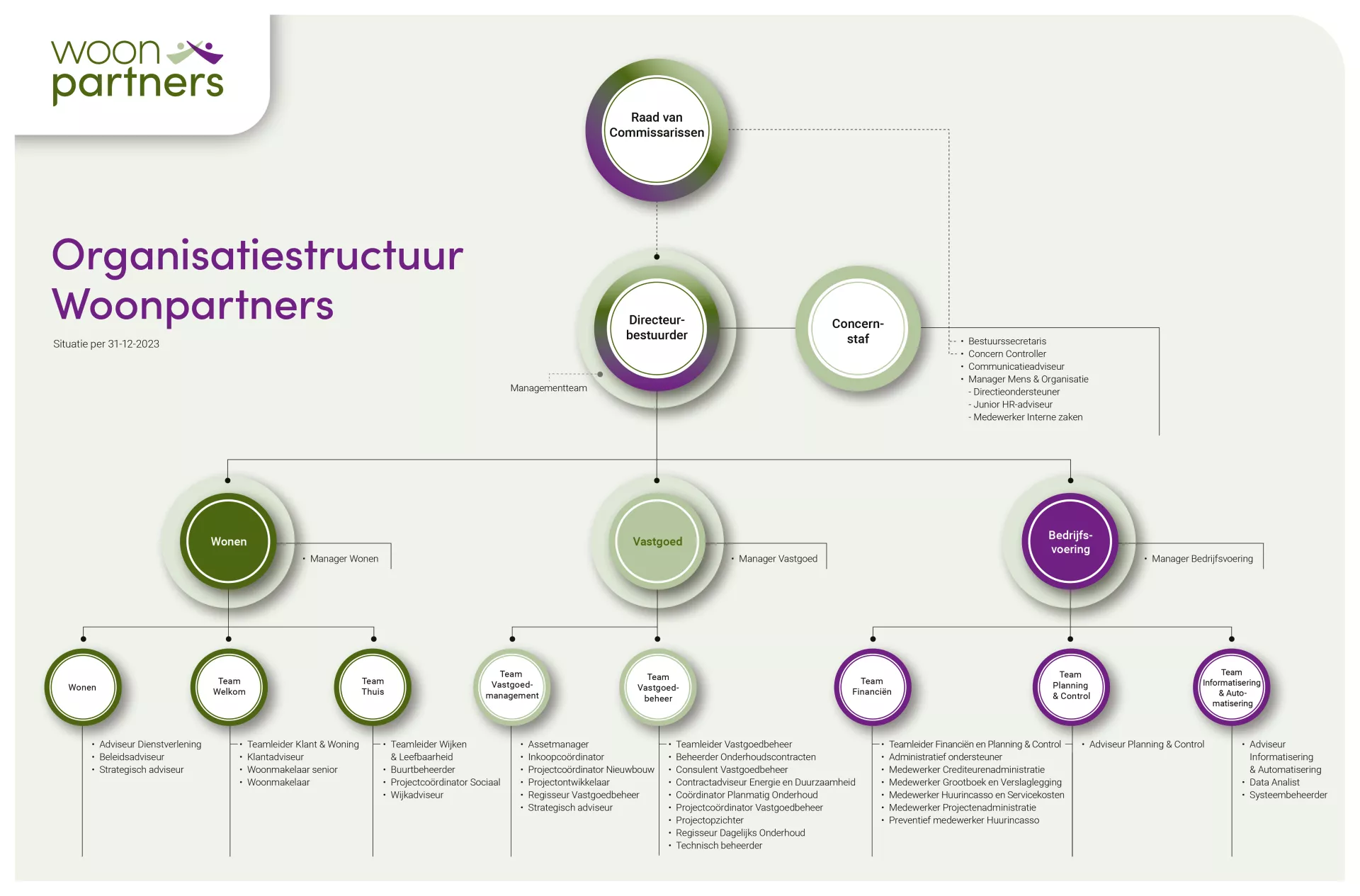 De directeur-bestuurder neemt in samenspraak met het managementteam de besluiten binnen Woonpartners. Het managementteam bestaat uit 4 managers die dagelijks leidinggeven aan de verschillende afdelingen binnen Woonpartners. Zij worden hierin bijgestaan door 4 teamleiders.